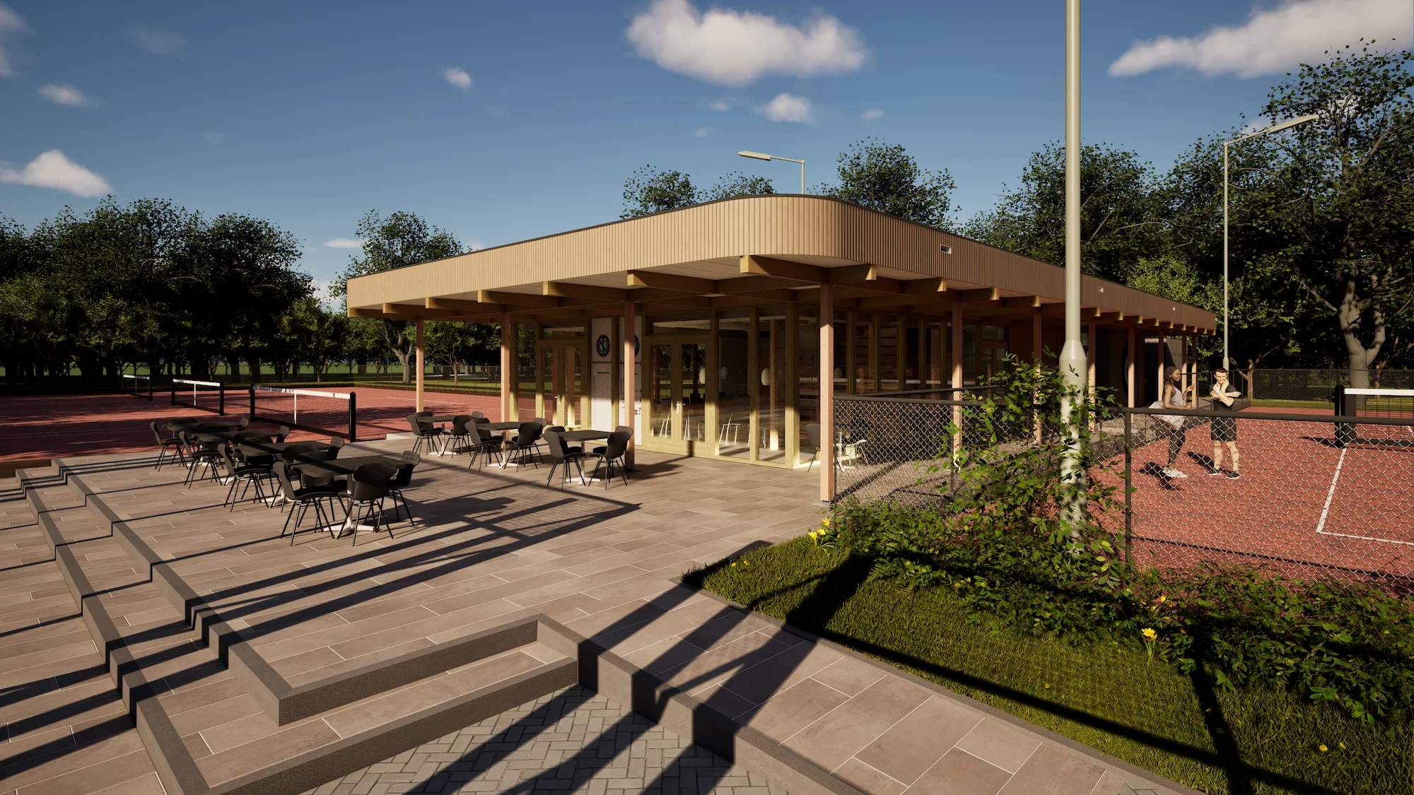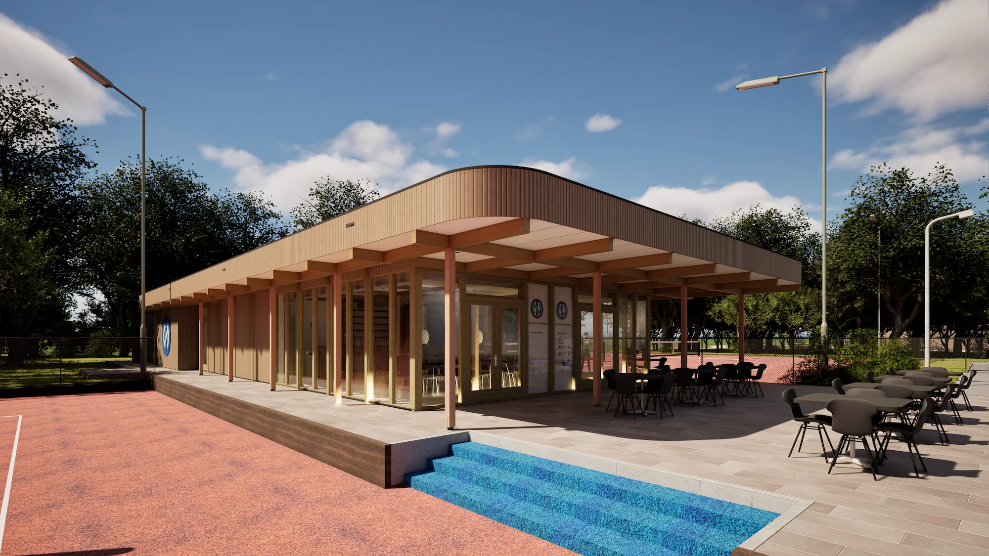Het resultaat is een open en functioneel clubgebouw dat als nieuw middelpunt van de vereniging dient en een sterke relatie legt tussen kantine, terras en banen.