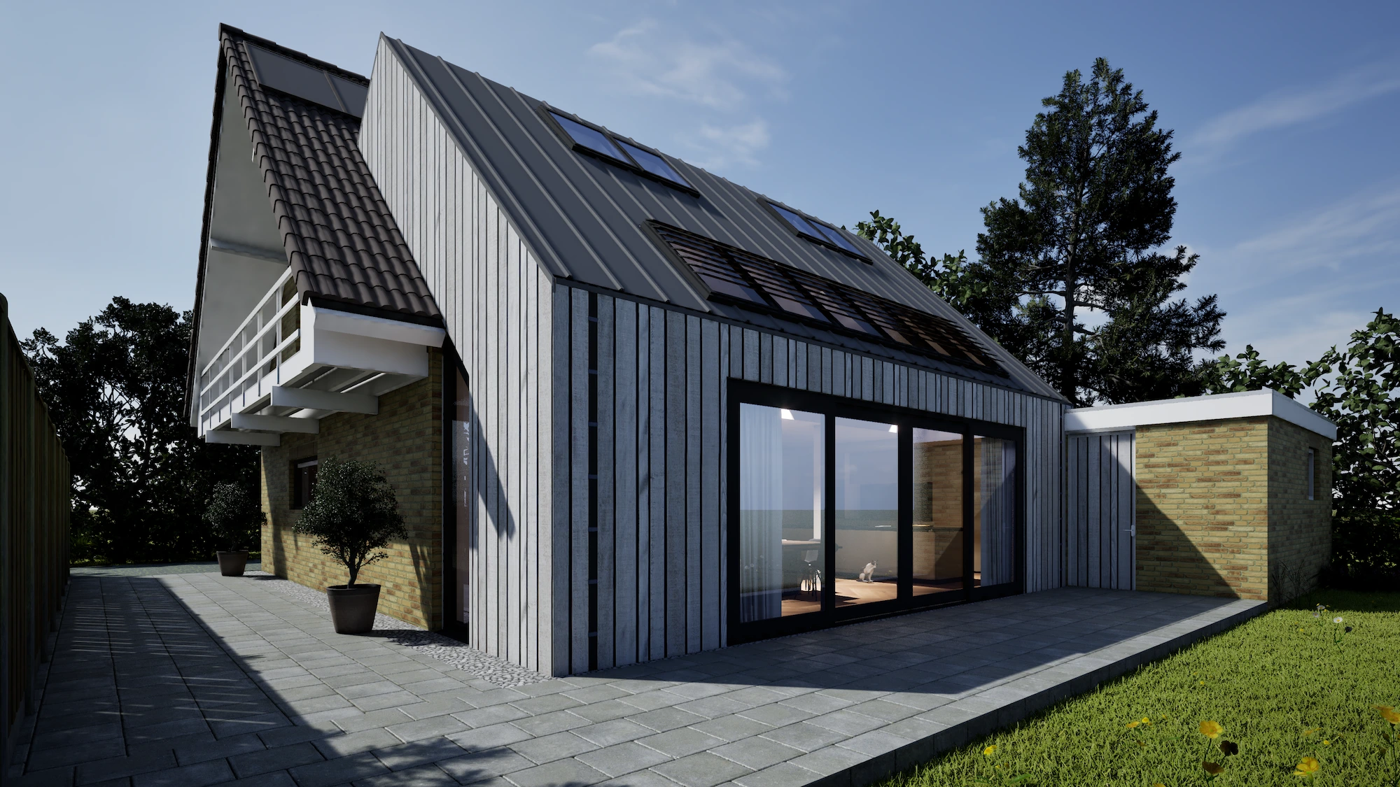 De aanbouw is bewust ontworpen als een ingetogen volume, met donkere gevelbekleding die de uitbreiding laat aansluiten op de bestaande woning zonder te overheersen. De detaillering is strak, het materiaalgebruik duurzaam en onderhoudsarm – passend bij hedendaagse bouweisen.